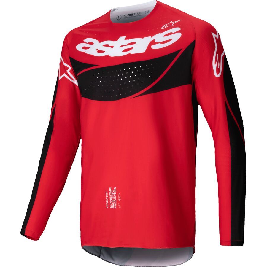 The lightweight Techstar Jersey, with its athletic race fit, features an updated multi-material construction with a precisely body-mapped poly-fabric stretch main chassis that incorporates ergonomic stretch inserts for premium mobility and enhanced rider comfort.