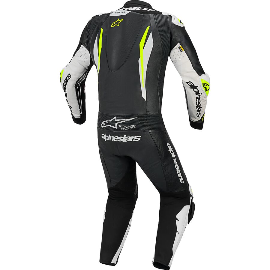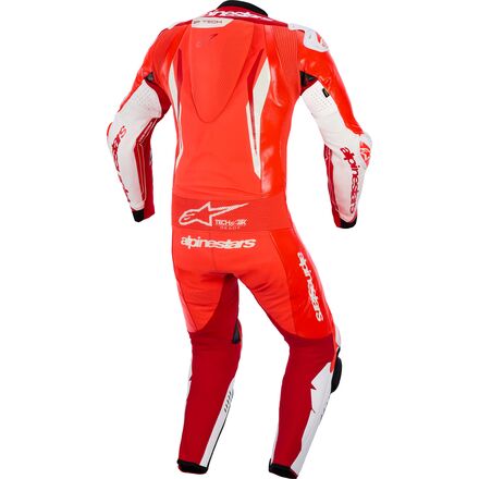 - Equipped with Alpinestars GP Tech Knee Slider - Optimized for track use and featuring an anatomical design for optimal contact, even-wear distribution, and lighter weight, its slim profile hook-and-loop patch with strategically positioned v-cuts enables a more precise placement on the knee while also preventing material bunching, enhancing aerodynamic performance even further.