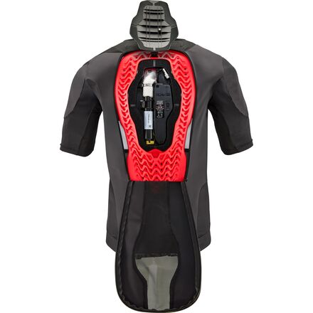 The airbag features strategically positioned cutaways that contour to the rider's body for superior impact protection of the back, check, ribs, and shoulders, while also minimizing material volume.