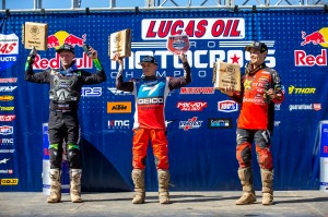 Elsewhere, rookie Chase Sexton took second overall on a (3-4) day, his first 450 class podium. Justin Barcia (6-2) took third overall after putting on a racing clinic in Moto 2 and finishing second despite tangling with Adam Cianciarulo a few times before pulling away. Marvin Musquin (2-6) took fourth on the tie-breaker to Barcia and Cianciarulo (5-3) rounded out the Top 5.