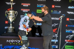 But with an empty stadium and minus the mob of fans surrounding him at the Championship presentation all Tomac could muster was a great big smile and a nod or two at the cameras while holding the 2020 Supercross Championship plate without any roar of the crowd.