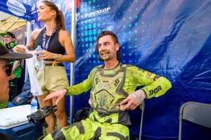 Cooper Webb (6-23), the reigning Supercross champion, squirreled into the ground then tossed of his bike after landing on the edge of the track in soft sand coming off the finish line jump in Moto but returned to the race and finished 23rd.