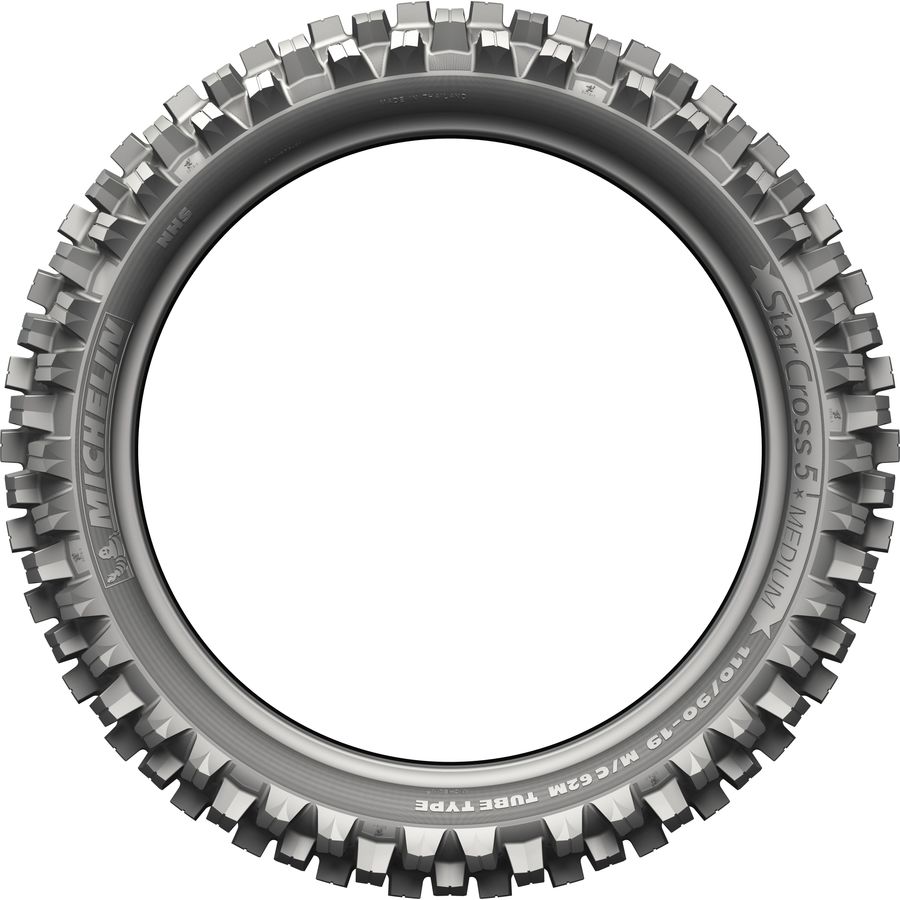 Tread designs for the StarCross 5 range of tires improve performance across a multitude of applications. The intermediate and side tread blocks ensure good steering response from the front tire and traction from the rear. The central blocks are designed specifically to enhance braking performance and traction on all types of riding surfaces. Integrating Michelin innovations shared across tires for agriculture and off-road truck racing, the Michelin StarCross 5 line sports a self-cleaning tread design to help release soil from the tire. The design includes revolutionary fine horizontal tread lines to release soil and enhance traction in a range of different soil conditions.