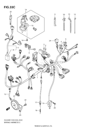2ND AIR AIR CLEANER BATTERY BATTERY HOLDER CAM CHAIN CAMSHAFT / VALVE CARRIER CLUTCH COWL BODY INSTALLATION PARTS COWLING BODY CRANKCASE CRANKCASE COVER CRANKSHAFT CYLINDER ELECTRICAL (MODEL K7) ELECTRICAL (MODEL K8/K9) EVAPO SYSTEM (E33) FOOTREST FRAME FRAME COVER FRONT BRACKET FRONT BRAKE HOSE (DL650AK7/AK8/AK9) FRONT BRAKE HOSE (DL650K7/K8/K9) FRONT CALIPER FRONT CYLINDER HEAD FRONT DAMPER FRONT FENDER (MODEL K7) FRONT FENDER (MODEL K8) FRONT FENDER (MODEL K9) FRONT MASTER CYLINDER FRONT WHEEL (DL650AK7/AK8/AK9) FRONT WHEEL (DL650K7/K8/K9) FUEL PUMP FUEL TANK (MODEL K7) FUEL TANK (MODEL K8) FUEL TANK (MODEL K9) GASKET SET GEAR SHIFTING HANDLE LEVER HANDLE SWITCH HANDLEBAR HEADLAMP HYDRAULIC UNIT (DL650AK7/AK8/AK9) LABEL (MODEL K7) LABEL (MODEL K8/K9) MAGNETO (MODEL K7) MAGNETO (MODEL K8/K9) MUFFLER OIL COOLER OIL PUMP OPTIONAL RADIATOR RADIATOR HOSE REAR CALIPER (DL650AK7/AK8/AK9) REAR CALIPER (DL650K7/K8/K9) REAR CUSHION LEVER REAR CYLINDER HEAD REAR FENDER REAR MASTER CYLINDER (DL650AK7/AK8/AK9) REAR MASTER CYLINDER (DL650K7/K8/K9) REAR SWINGING ARM REAR WHEEL (DL650AK7/AK8/AK9) REAR WHEEL (DL650K7/K8/K9) SEAT SEAT TAIL COVER (MODEL K7) SEAT TAIL COVER (MODEL K8) SEAT TAIL COVER (MODEL K9) SIDE COWLING (MODEL K7) SIDE COWLING (MODEL K8) SIDE COWLING (MODEL K9) SIDE COWLING INSTALLATION PARTS SPEEDOMETER STAND STARTER CLUTCH STARTING MOTOR STEERING STEM TAIL LAMP THROTTLE BODY THROTTLE BODY FITTING TRANSMISSION TURNSIGNAL LAMP (MODEL K7/K8) TURNSIGNAL LAMP (MODEL K9) WATER PUMP WIRING HARNESS (DL650AK7) WIRING HARNESS (DL650AK8/AK9) WIRING HARNESS (DL650K7) WIRING HARNESS (DL650K8/K9)