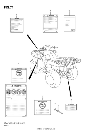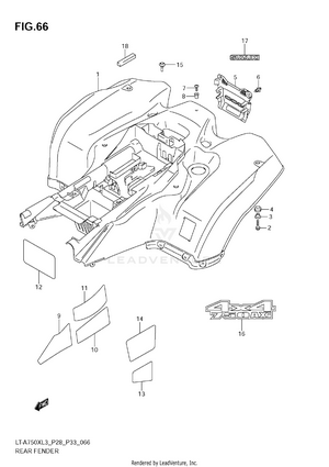 AIR CLEANER BATTERY CAM CHAIN CAM SHAFT/VALVE CARRIER (LT-A750XL3 E28) CARRIER (LT-A750XL3 E33) CARRIER (LT-A750XZL3 E33) COOLING DUCT CRANK BALANCER CRANKCASE CRANKCASE COVER CRANKSHAFT CYLINDER CYLINDER HEAD CYLINDER HEAD COVER ELECTRICAL FINAL BEVEL GEAR (FRONT) FINAL BEVEL GEAR (REAR) FOOTREST FRAME FRONT BOX FRONT BRAKE HOSE FRONT CALIPER FRONT DRIVE SHAFT FRONT FENDER (LT-A750XL3 E28) FRONT FENDER (LT-A750XL3 E33) FRONT FENDER (LT-A750XZL3 E33) FRONT GRILLE (LT-A750XL3 E28) FRONT GRILLE (LT-A750XL3 E33) FRONT GRILLE (LT-A750XZL3 E33) FRONT MASTER CYLINDER FRONT SUSPENSION ARM FRONT WHEEL (LT-A750XL3 E28) FRONT WHEEL (LT-A750XL3 E33) FRONT WHEEL (LT-A750XZL3 E33) FUEL PUMP FUEL TANK GASKET SET GEAR SHIFTING HANDLE COVER (LT-A750XL3 E28) HANDLE COVER (LT-A750XL3 E33) HANDLE COVER (LT-A750XZL3 E33) HANDLE LEVER HANDLEBAR HEADLAMP (LT-A750XL3 E28) HEADLAMP (LT-A750XL3 E33) HEADLAMP (LT-A750XZL3 E33) LABEL (LT-A750XL3 E28) LABEL (LT-A750XL3 E33) LABEL (LT-A750XZL3 E33) LEFT REAR WHEEL (LT-A750XL3 E28) LEFT REAR WHEEL (LT-A750XL3 E33) LEFT REAR WHEEL (LT-A750XZL3 E33) MAGNETO MUDGUARD MUFFLER OIL PUMP OPTIONAL RADIATOR (LT-A750XL3 E28) RADIATOR (LT-A750XL3 E33) RADIATOR (LT-A750XZL3 E33) RADIATOR HOSE REAR BOX REAR BRAKE REAR BRAKE ASSY REAR COMBINATION LAMP (LT-A750XL3 E28) REAR COMBINATION LAMP (LT-A750XL3 E33) REAR COMBINATION LAMP (LT-A750XZL3 E33) REAR DRIVE SHAFT REAR FENDER (LT-A750XL3 E28) REAR FENDER (LT-A750XL3 E33) REAR FENDER (LT-A750XZL3 E33) REAR SHOCK ABSORBER REAR SUSPENSION ARM RECOIL COVER RIGHT REAR WHEEL (LT-A750XL3 E28) RIGHT REAR WHEEL (LT-A750XL3 E33) RIGHT REAR WHEEL (LT-A750XZL3 E33) SEAT SECONDARY DRIVE SHIFT LEVER SPEEDOMETER (LT-A750XL3 E28) SPEEDOMETER (LT-A750XL3 E33) SPEEDOMETER (LT-A750XZL3 E33) STARTER CLUTCH STARTING MOTOR STEERING KNUCKLE STEERING SHAFT THROTTLE BODY TRANSMISSION (1) TRANSMISSION (2) WATER PUMP WIRING HARNESS (LT-A750XL3 E28) WIRING HARNESS (LT-A750XL3 E33) WIRING HARNESS (LT-A750XZL3 E33)