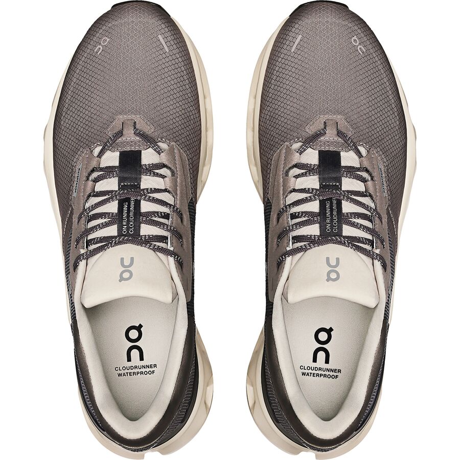 Learn MoreThe On Cloudrunner 2 Waterproof Shoeprovides the airy cushioning, forward propulsion, and sleek style that we love, now with a waterproof membrane and updated features to keep us going. The new underfoot construction prevents rocks from sticking into the sole, keeping our motion fluid and ending stops to shed stones. Helion superfoam offers the energy transfer we need for speed, and Cloudtec cushioning keeps our feet fatigue-free and comfortable.