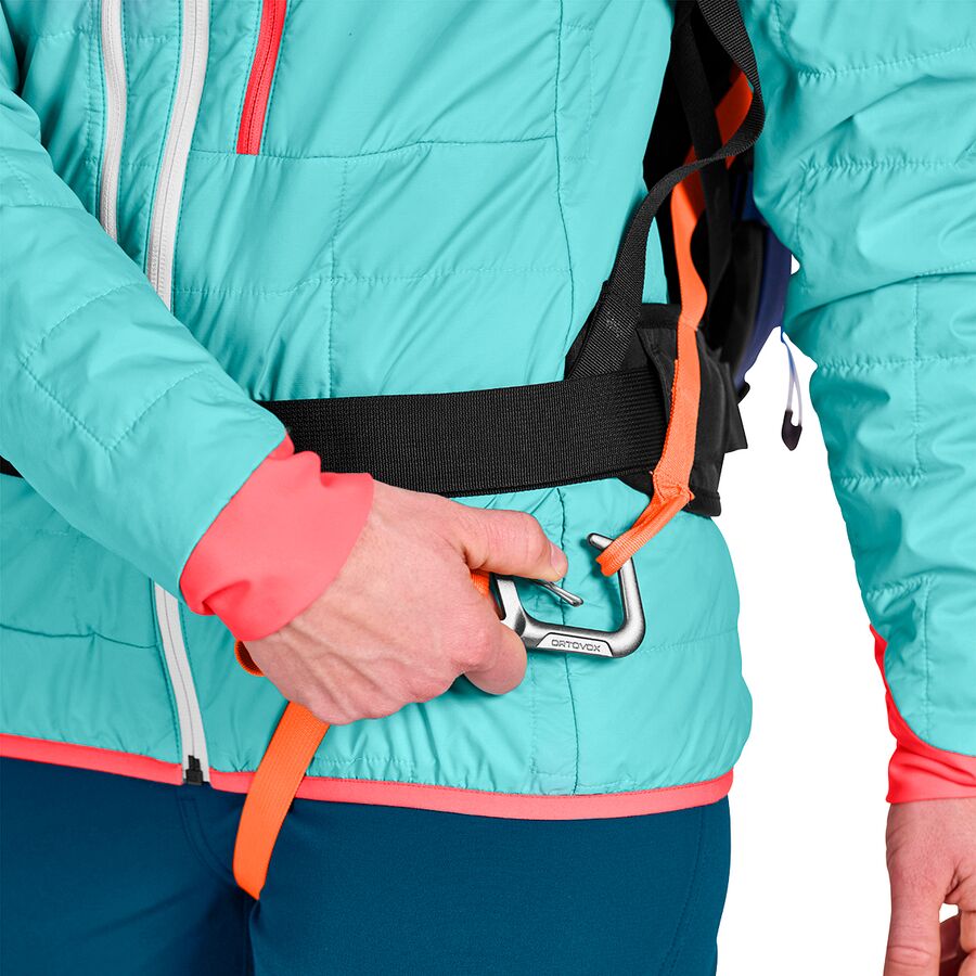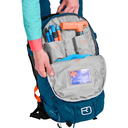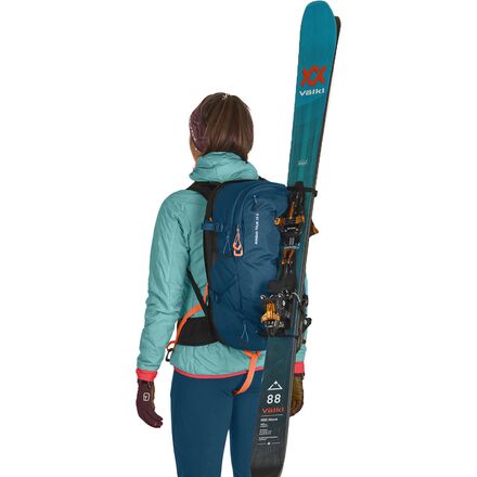 At the heart of the pack is the LiTRIC electronic airbag system, which replaces cartridges with supercapacitors and a high-speed fan. This design allows for quick USB-C charging, multiple practice deployments, and consistent performance in cold temperatures without the travel limitations of compressed gas. A height-adjustable deployment handle, leg loop with carabiner clip, and high-visibility avalanche tool compartment add confidence and ease of use when conditions demand focus. With diagonal ski carry, vertical snowboard carry, rope attachment points, and zip-on compatibility, the Tour S adapts seamlessly to changing objectives throughout the season.