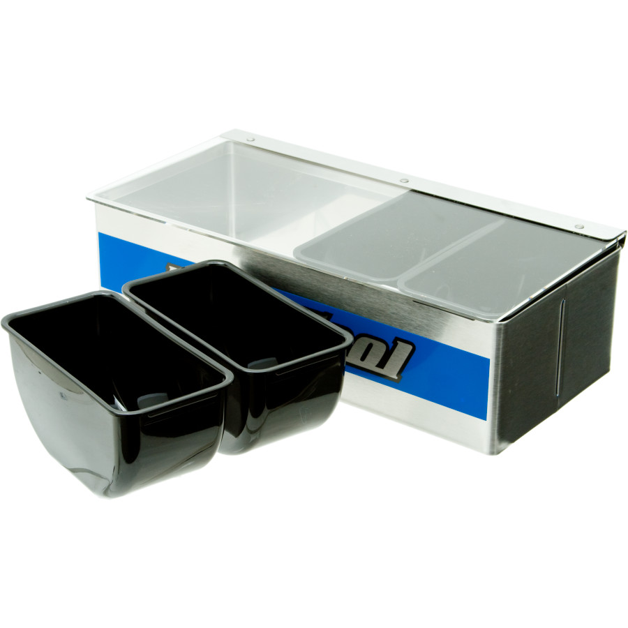 Stainless steel construction with a clear acrylic hinged top and four removable bins.