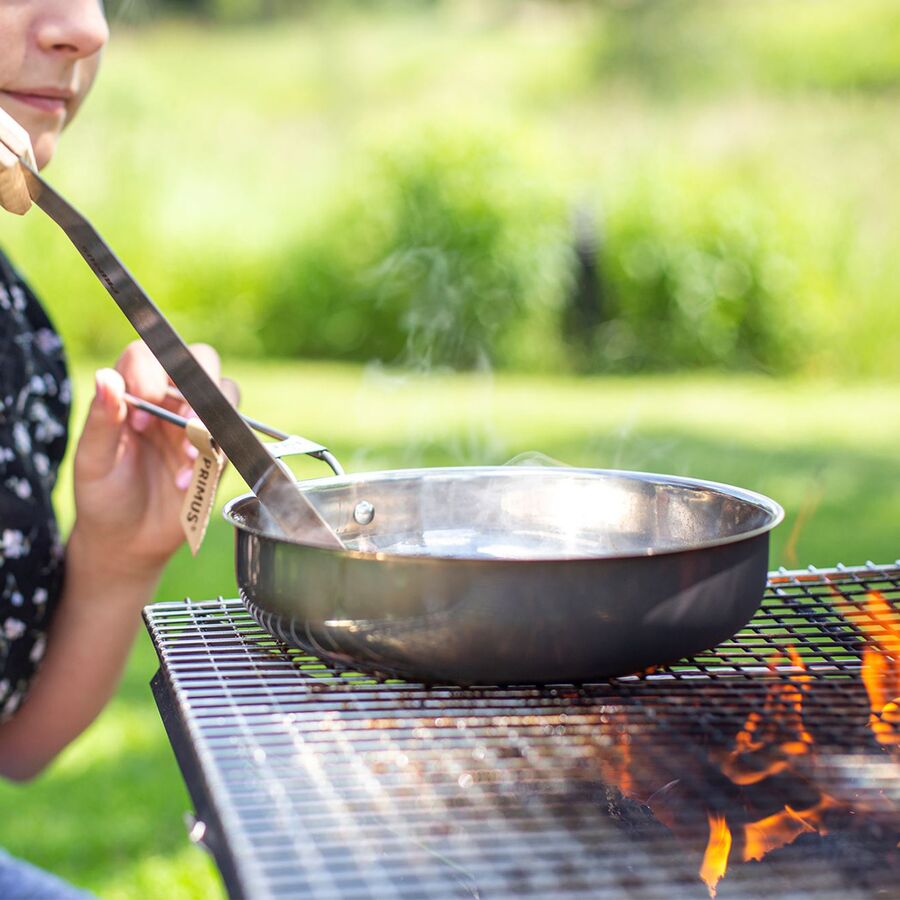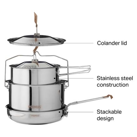 Learn MoreWe eat like kings when cooking up camp meals in the Primus Large CampFire Cookset. This stackable set includes two different size pots and a frying pan that fit neatly together for easy storage. Durable 18/8 stainless steel construction provides years of reliable use, and an aluminum-clad bottom on the frying pan ensures even heat distribution. The large pot can even be suspended over an open fire thanks to the integrated handle, and the pot lids have built-in colanders to make draining water quick and easy.