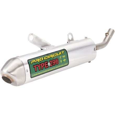 The Type 296 Spark Arrestor is specially engineered with an internal metal baffle, chambers and sound absorbing materials for a muffled exhaust sound and no loss of motor performance. The primary difference between the Type 296 Silencer and other Pro Circuit exhausts is the longer canister designed to lower the noise level to within legal limits. The desired sound level is at or near 96dB on most models.