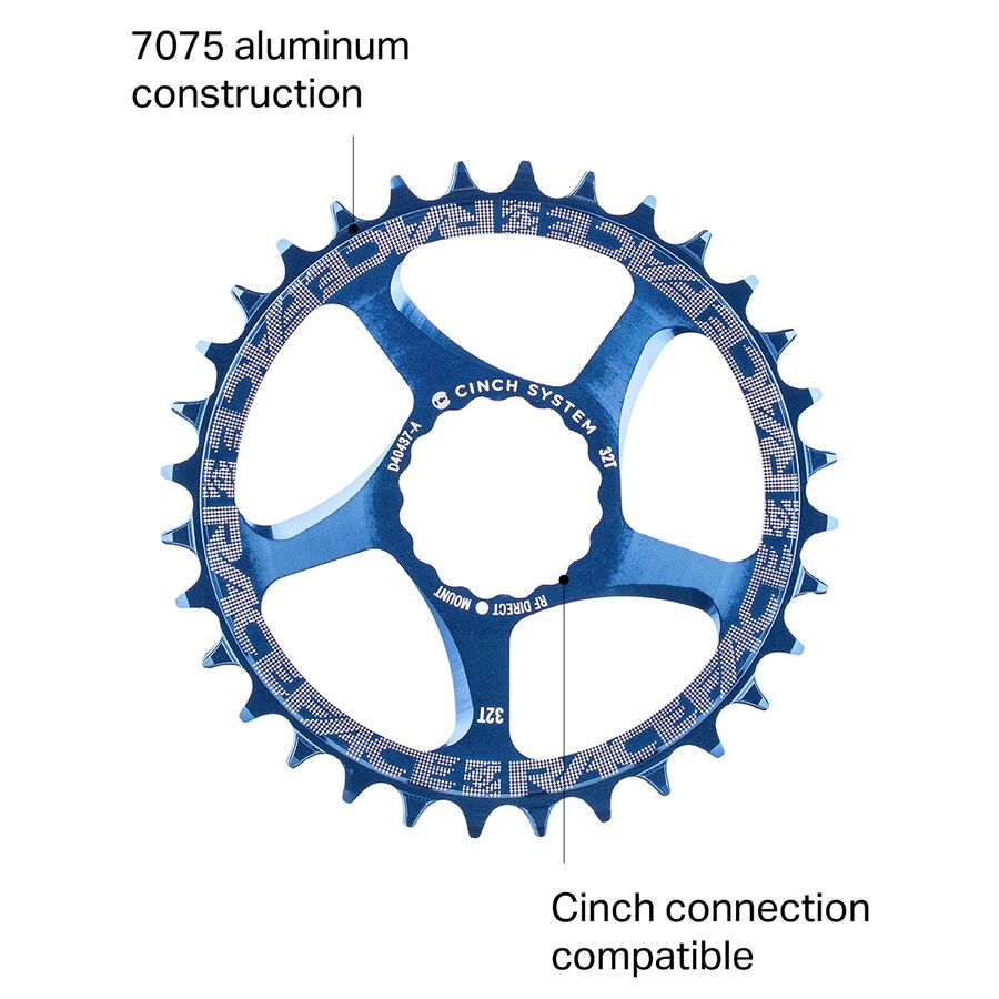 Learn MoreOf all the recent innovations in mountain biking, the Narrow Wide tooth profile featured on the Narrow Wide Cinch Direct Mount Chainring is arguably the most understated progression. Race Face has designed a tighter interface between the inner and outer links to prevent the chain from jumping. The Narrow Wide Cinch Direct Mount Chainring eliminates the weakness of four-bolt interfaces, and its 7075-T6, 4mm-thick, aerospace-grade aluminum transfers pedal loads without flexing, offering the lightest and stiffest interface between Race Face cranks.