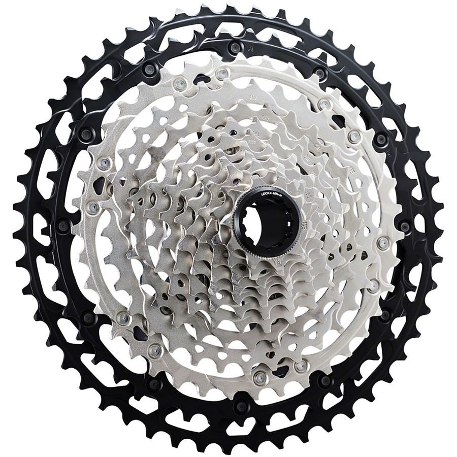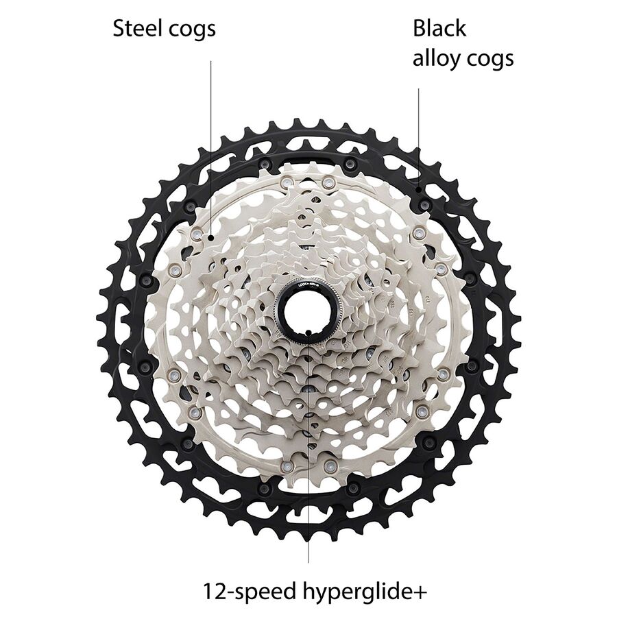 Shimano's new 12-speed cassettes are available with two different gearing options the 10 - 51-tooth Wide Range option, for a massive gear range that gets you up the steepest fire roads with ease, while maintaining serious power for hammering to the front of the pack, or the Rhythm Step cassette with a 10 - 45-tooth range, designed to give more options for those of us who struggle to find the perfect gearing on a ride, or want the flexibility to run one-by or two-by cranks. Both cassettes are designed to offer the best mountain bike shifting available, with redesigned chain plates and shift ramps that pair together to guide the chain up and down the cassette with faster, smoother shifting, and better engagement to reduce the chance of dropped chains.