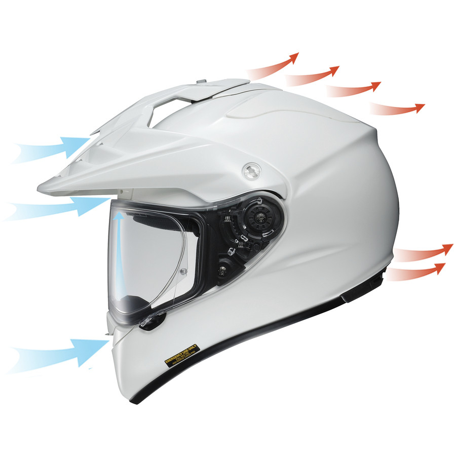- Ventilation Performance: A well-ventilated helmet is essential to dual-sport riding and the many challenges it can present thanks to varying speeds, weather conditions, and levels of physical exertion. During the design process of the Hornet X2, SHOEI utilized its state-of-the-art wind tunnel facility to help develop the optimal balance between airflow, silence, and functionality. Equipped with a large, multi-position lower air intake / defroster optimized for fresh air inhalation and clear vision, two shutter-controlled upper air vents for optimal air intake and head cooling, four uniquely-positioned rear exhaust outlets to take better advantage of negative pressure suction, and three neck outlet vents work together to yield unrivaled cool-air intake and hot-air expulsion.