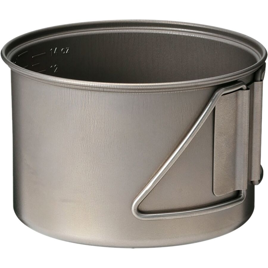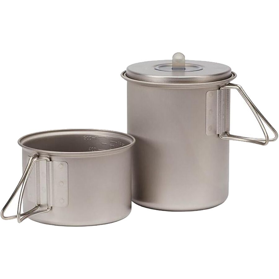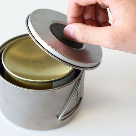 The 28-ounce pot and 10-ounce cup fit together for compact carrying in your pack, complete with a mesh bag for keeping both pieces together. The pot fits a Snow Peak GigaPower Stove and one 110-gram fuel canister inside or two 110-gram fuel canisters for a more streamlined set-up. Folding handles allow you to cook and serve yourself without taking up room in your pack.