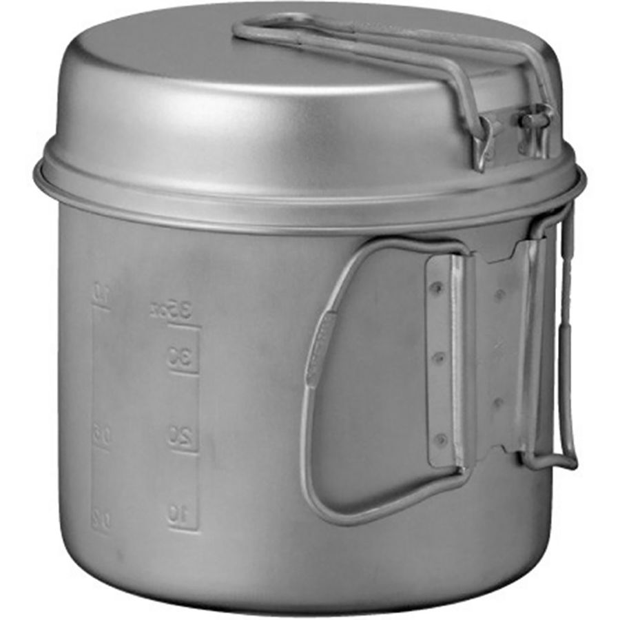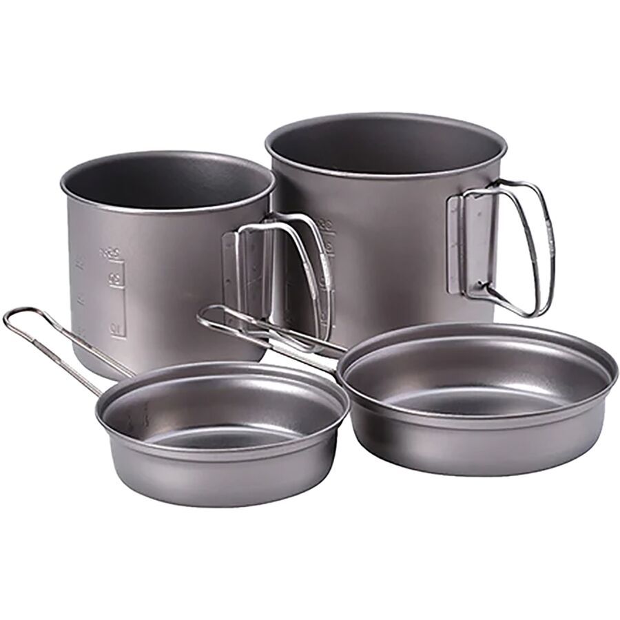 The Snowpeak Trek Combo Titanium Cook Set is a lightweight, 4-piece cook set that will allow even minimalist backpackers to whip up gourmet meals in the backcountry. Corrosion-resistant titanium is super lightweight and has superior strength compared to steel. This set includes two pots (47 oz and 30 oz) and two lids that double as fry pans (5 x 1 and 5 x 1 ). The smaller set fits neatly inside the larger set, reducing the stowed size to 5 x 6. The entire set weights a mere 13 oz. Each piece has a folding handle that tucks neatly away. The Snow Peak Giga Power Stove [SNO0002] and fuel canister stow nicely inside the cookware for easy transport and storage.