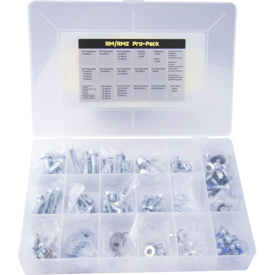 Learn MoreThe Suzuki RM/RMZ Pro-Pack Hardware Kit contains over 170 pieces of O.E.M. type hardware in factory style and finish. All Turner Performance Products hardware meets or exceeds O.E.M. quality and specifications.